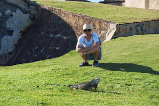 (above) Climbing El Morro, a colonial, Spanish fort. (below) the view from the fort and Russ with an Iguana that lived in the neighboring fort, San Cristobal.